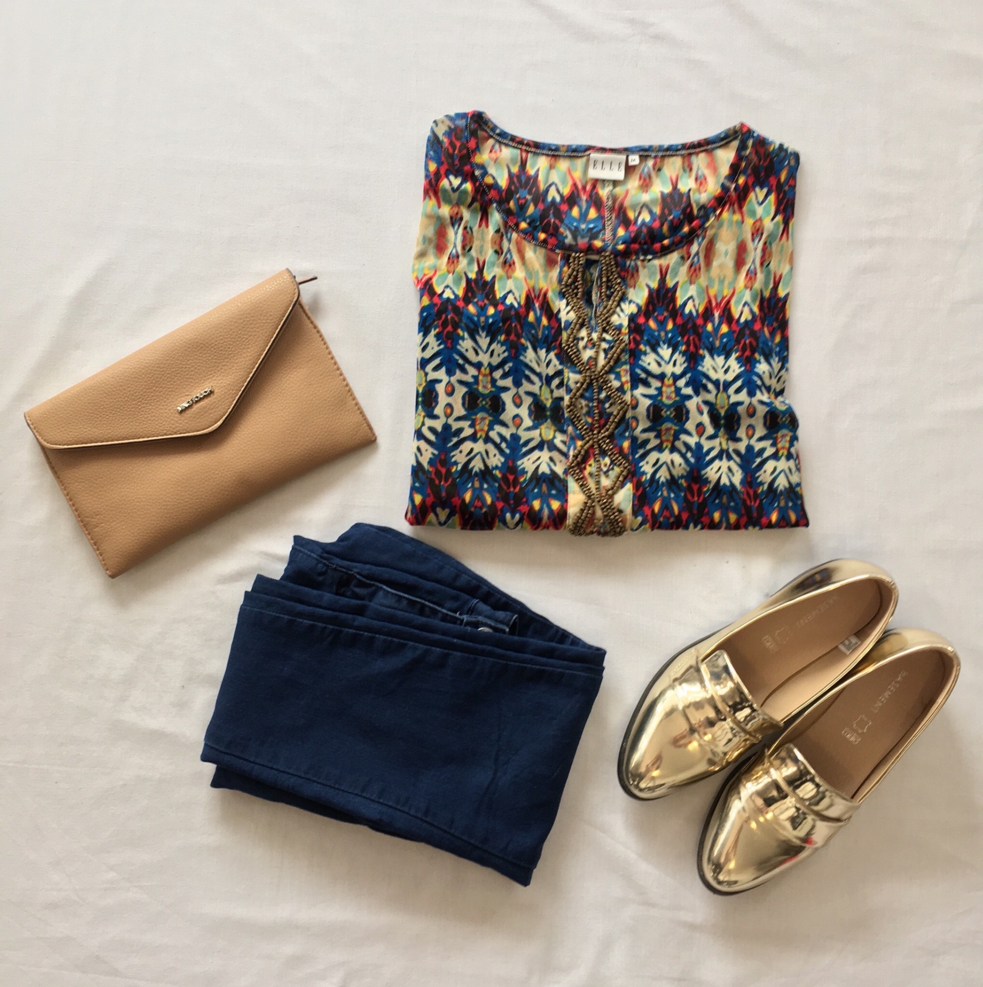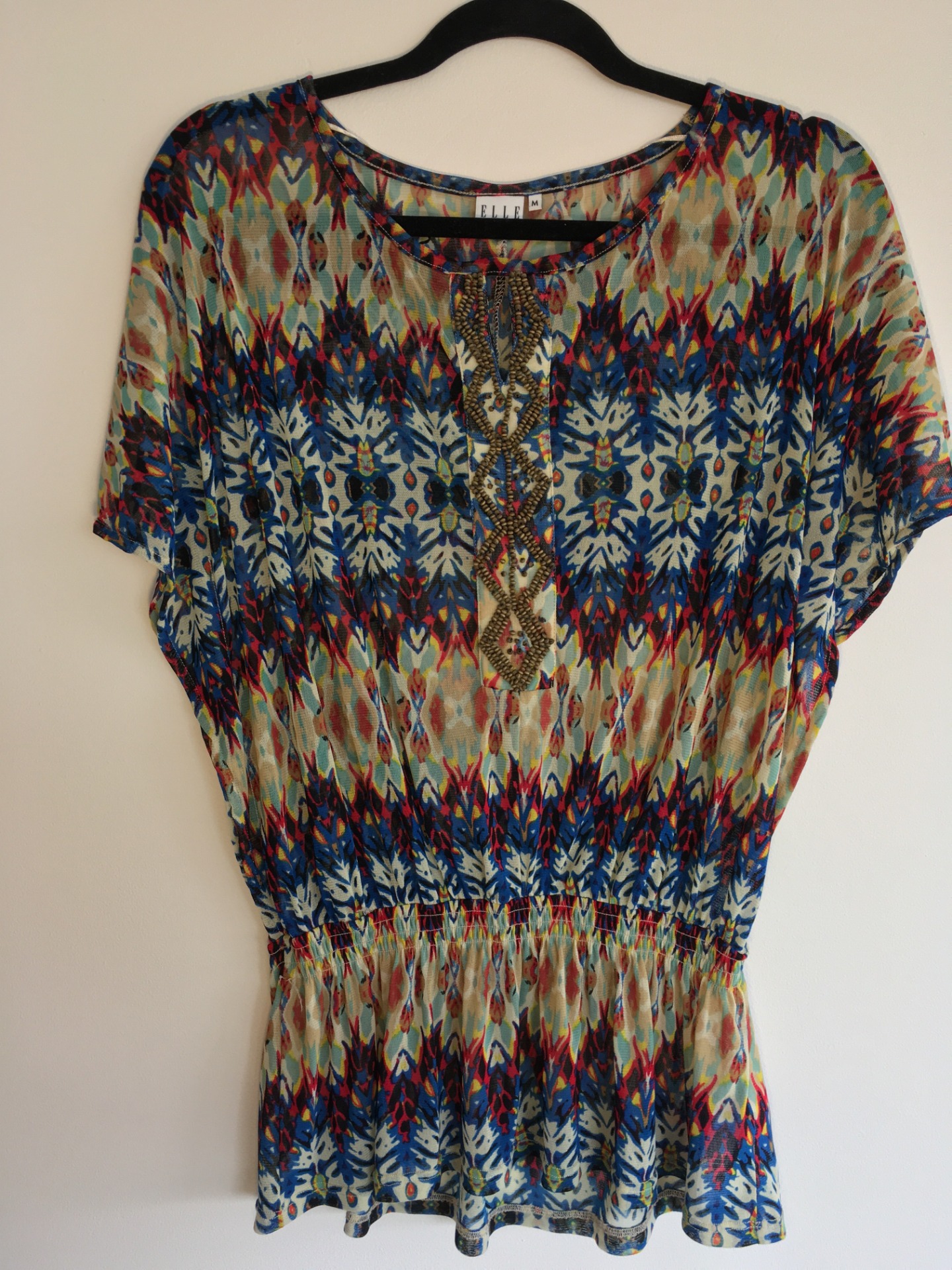 Blusa marca Elle, diseño étnico con aplicaciones de mostacillas en el centro y elástico en la cintura.